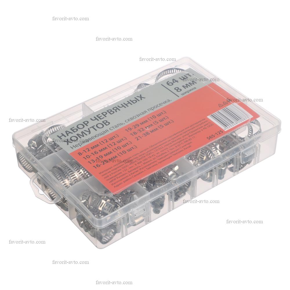 Набор червячных хомутов, сквозная просечка, от 8 до 38 мм, нерж. сталь, 64 шт |