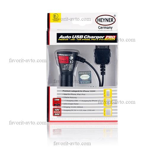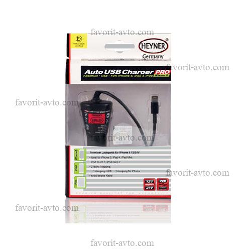 Зарядное устройство от прикуривателя а/м для iPhone,iPad, iPod с кабел.,c вых. USB (12/24V) HEYNER. 1/25 |