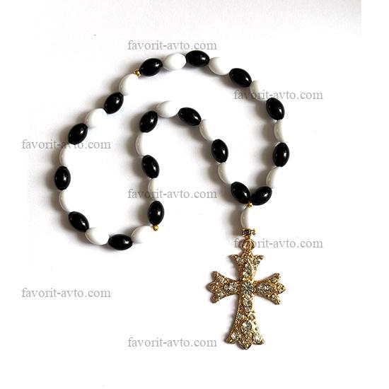 Подвеска на зеркало заднего вида, КРЕСТ с крупным камнем (ЗОЛОТО), четки (черные+белые) |
