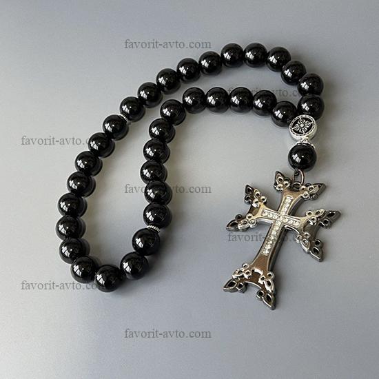 Подвеска на зеркало заднего вида, КРЕСТ с крупным камнем (ПЛАТИНУМ), четки (черные) |