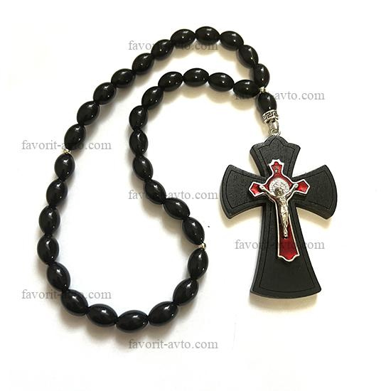 Подвеска на зеркало заднего вида, КРЕСТ (красный) крупный деревянный, четки (черные) |
