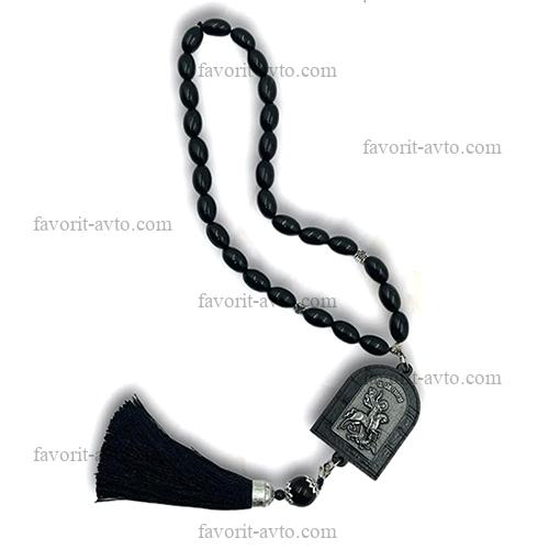 Подвеска на зеркало заднего вида, ИКОНА с кисточкой (Георгий Победоносец), четки (черные) |