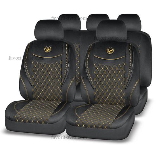 Авточехлы AUTOPREMIER ELEGANT, (ЧЁРНЫЙ/ ЗОЛОТАЯ НИТЬ), алькантара, SRS AIRBAG, карман, 5 мм поролон, 6 молний, 11 предметов, 1/5, ELG1030 |