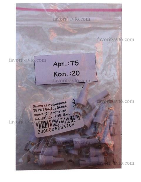 Лампа светодиодная Т5 (W2,0-4,6d) белая, конус (б/цокольная малая) 12v. 1/50. Мин. заказ 10шт. Арт.: Т5 |