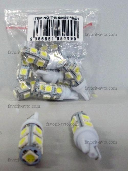 Лампа светодиодная Т10 SMD 9 (W2,1-9,5d) белая, 9 SMD 5050 диодов, (б/цокольная) 12V. Мин. 10шт. 1/10/1700 |