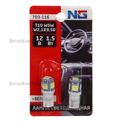 NG Лампа светодиодная T10, 1,5W (5SMD-5050),12В,белый, 2 шт., блистер |