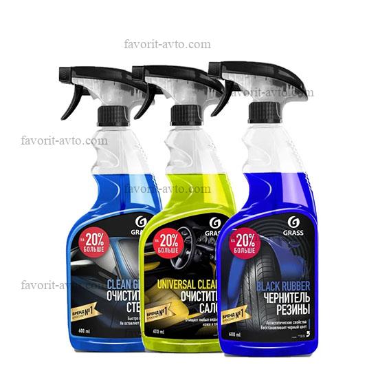 GraSS 286 Набор подарочный чернитель для шин Black rubber, Очиститель салона Universal cleaner, для стекол Clean Glass. уп-ка прозрачный пакет. |