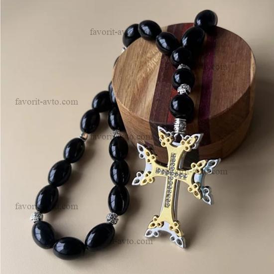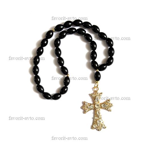 Подвеска на зеркало заднего вида, КРЕСТ с крупным камнем (ЗОЛОТО), четки (черные) |