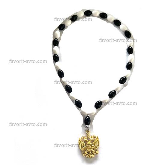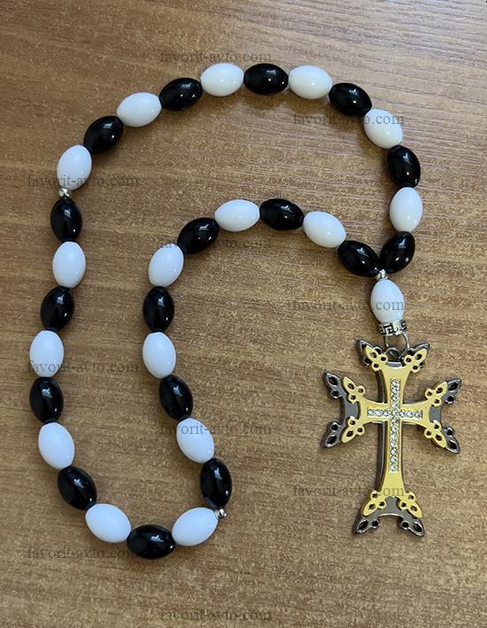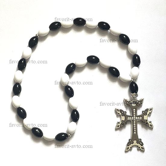 Подвеска на зеркало заднего вида, КРЕСТ с крупным камнем (ЗОЛОТО), четки (черные+белые) |