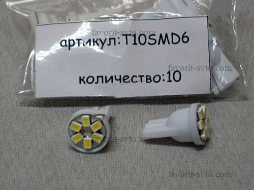 Лампа светодиодная Т10 (W2,1-9,5d) белая, 6 SMD 1210 диодов малая (б/цокольная) 12V. Арт.: Т10 SMD 6. Мин. 10шт. 1/10/2500 |