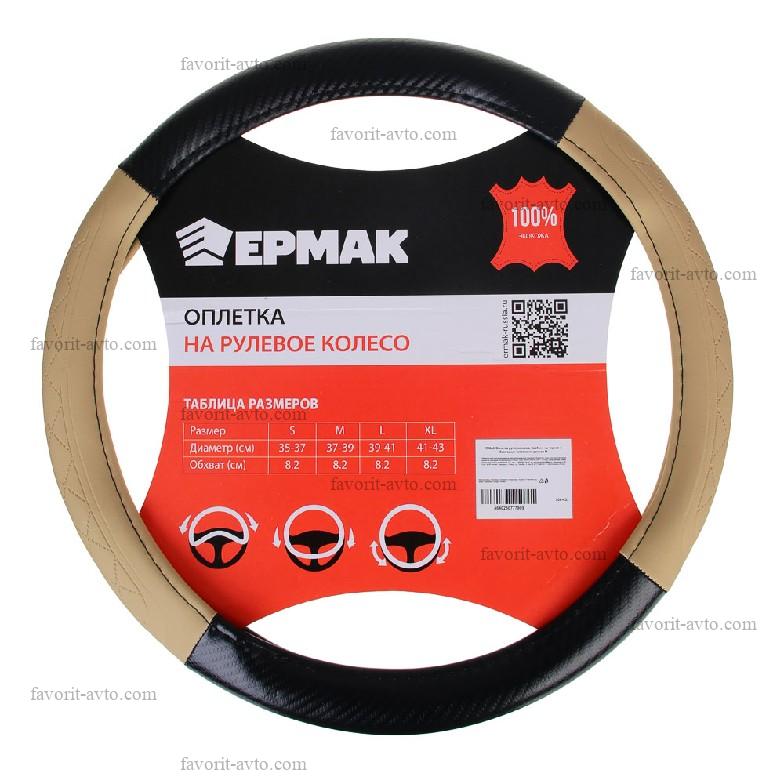 ЕРМАК Оплетка руля, экокожа, Карбон - А, черная с бежевыми вставками, размер М. 1/25 |